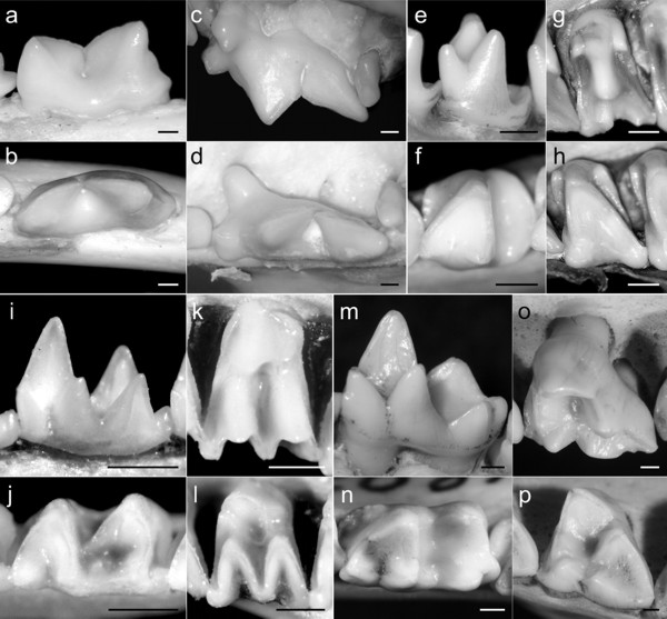 Mammalian tooth forms modeled in this paper. a-d: Carnassial, PM4 (a, b) and M1 (c, d) (Felis catus; Carnivora: Felidae). e-h: Zalambdodont, M2 (e, f) and M2 (g, h) (Tenrec ecaudatus; Insectivora: Tenrecidae). i-l: Dilambdodont, M2 (i, j) and M2 (k, l) (Myotis daubentoni; Chiroptera: Vespertilionidae). m-p: Tribosphenic, M2 (m, n) and M2 (o, p) (Didelphis virginiana; Didelphimorphia: Didelphidae). Lower right-side teeth in lingual (a, e, i, m) and occlusal (b, f, j, n) views; upper right-side teeth in lingual (c, g, k, o) and occlusal (d, h, l, p) views. Anterior to left. Scale bars = 1 mm.