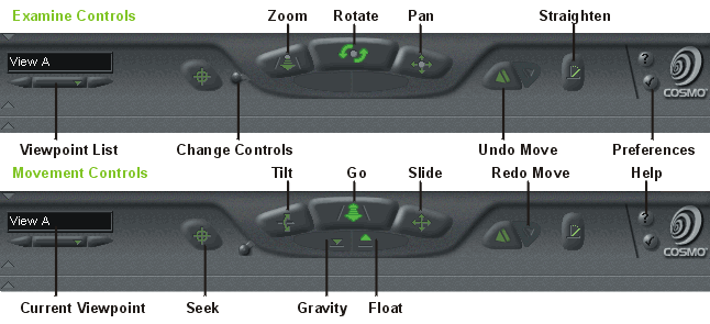When the VRML file is displayed on the screen, a dashboard like one of the views below is shown at the bottom of the scene. Two sets of controls are available: 'Examine Controls' and 'Movement Controls'. The user is able to toggle between these controls by clicking on the 'Change Controls' lever. The buttons on each control panel are explained below. For the majority of worlds on this site, it is easiest to use the Examine Controls.