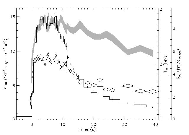 error region for the blackbody temperature (inner right-hand y-axis) in keV.