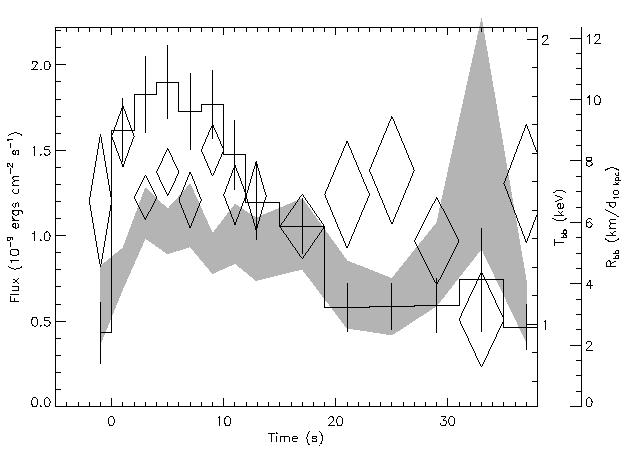 error region for the blackbody temperature (inner right-hand y-axis) in keV.
